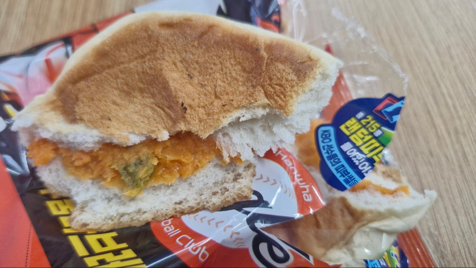 2. 맛 : 포장지를 열었을 때 야채호빵향이 났습니다. 한입 먹어보니 저 안에 쨈이 매운맛이 납니다. 매운 피자가 들어 있는 느낌이라고 할까요? 매운맛은 불닭보다 좀 더 매운 거 같습니다. 진짜 이글이글합니다. 빵은 진짜 폭신폭신합니다.