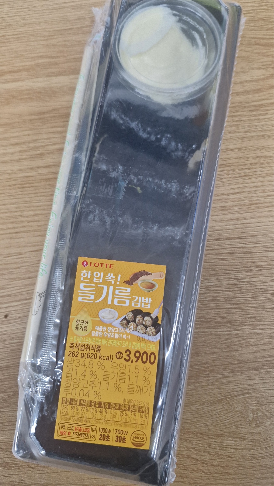2. 가격 : 3900원 일반 김밥에 비해 좀 비싼 편입니다. 구성품은 김밥+마요네즈+들기름이 들어 있습니다.