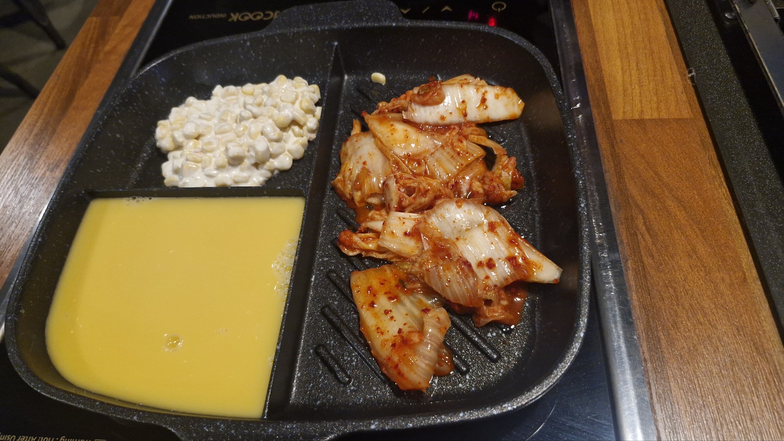 뜨거운 인덕션에 김치, 콘샐러드, 계란찜용물 이렇게 주십니다.