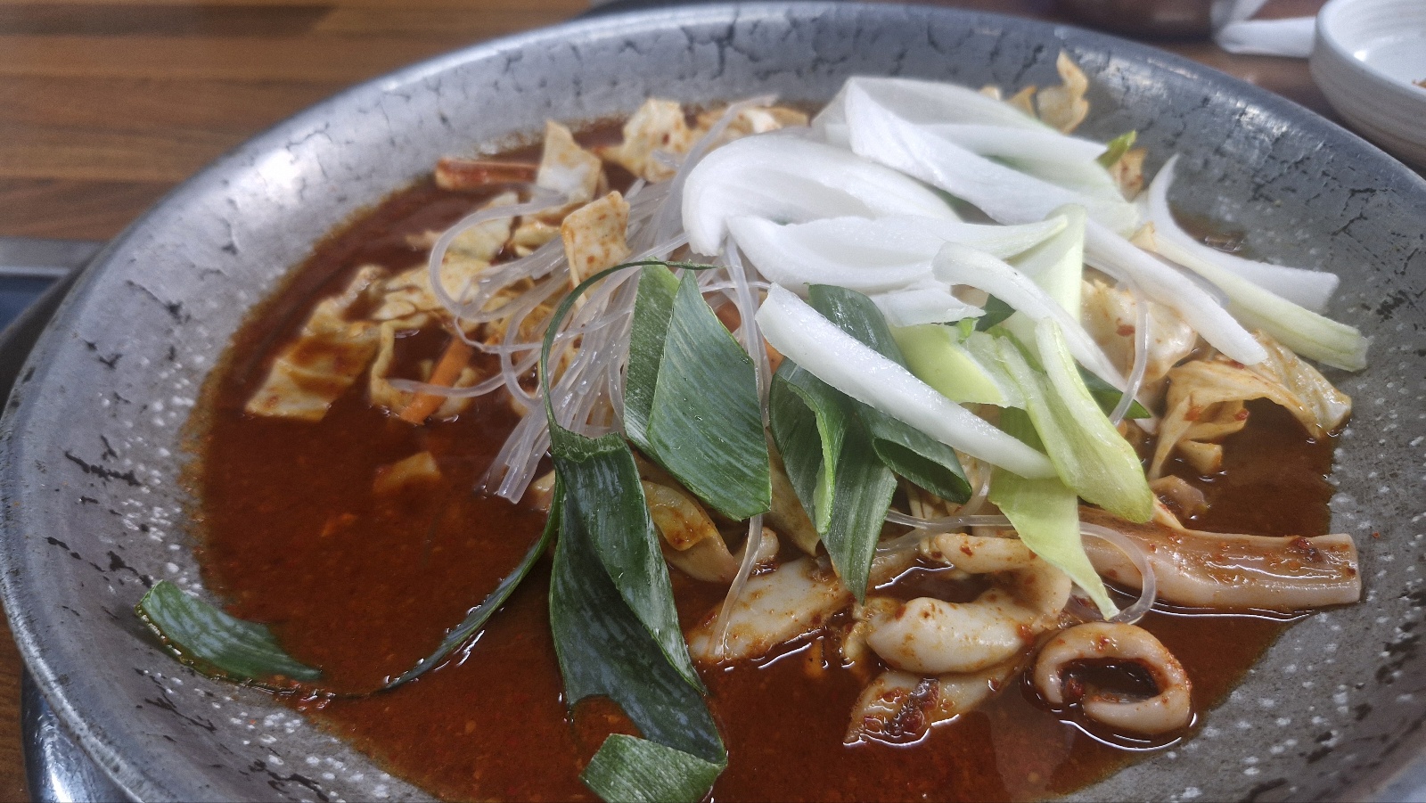 세월이 느껴지는 철판에 오징어와 파 량차 양배추 당면이 같이 들어 있습니다.