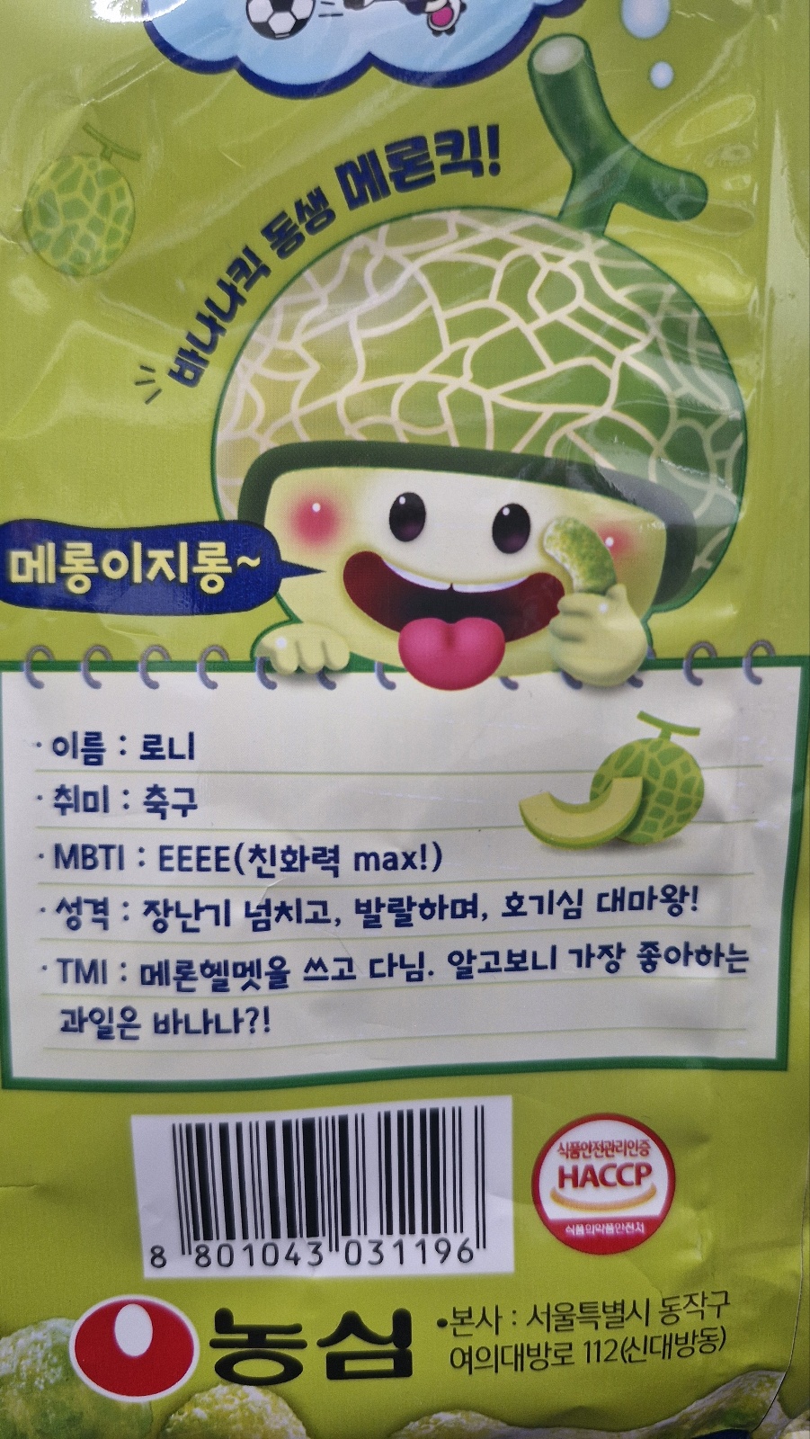 농심) 바나나킥에 후속작입니다. 바나나킥은 어린 친구들에 친구로 바나나향이 강하면서도 입에 넣으면 사르르 녹는 부드러운 식감이 장점이었는데, 과연 멜론킥은 어떨까 궁금했습니다. 여기도 멜론맛이 사르르~라고 표현이 되어 있습니다.