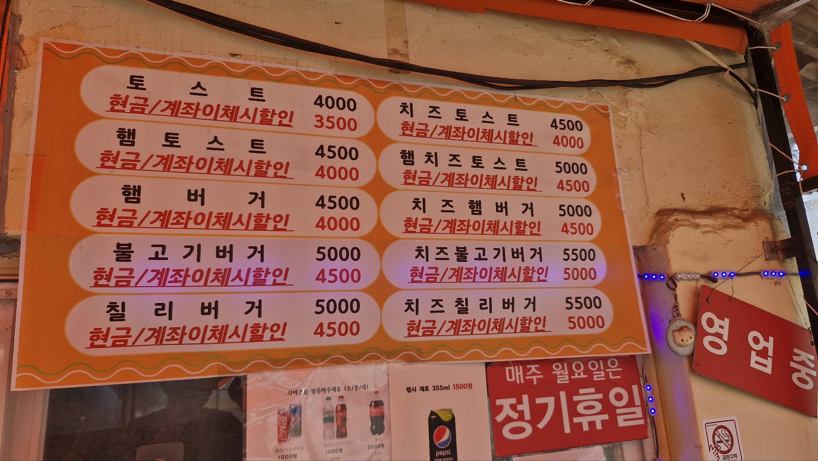 토스트 현금가 3500원, 햄버거 현금가 4000원