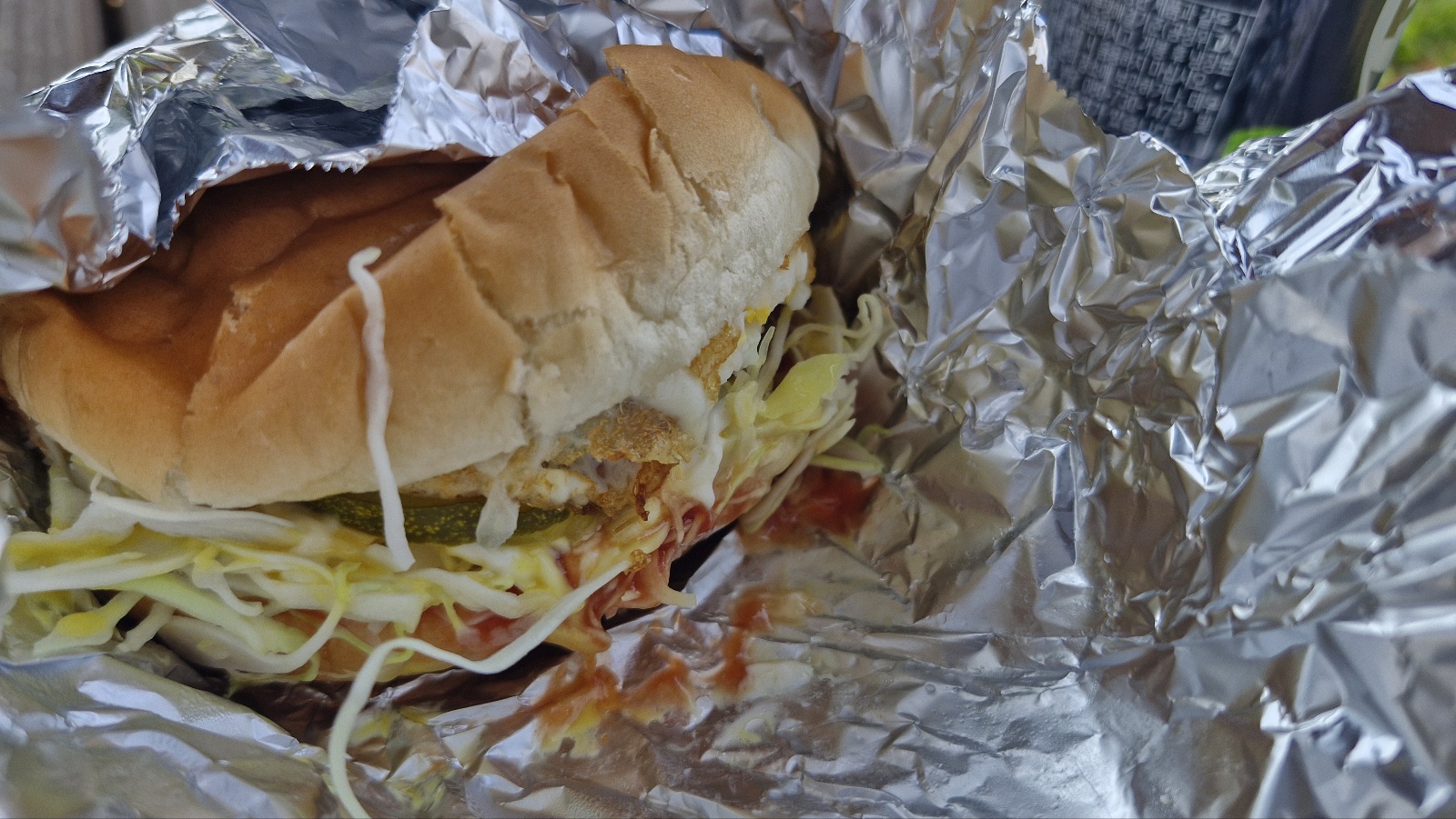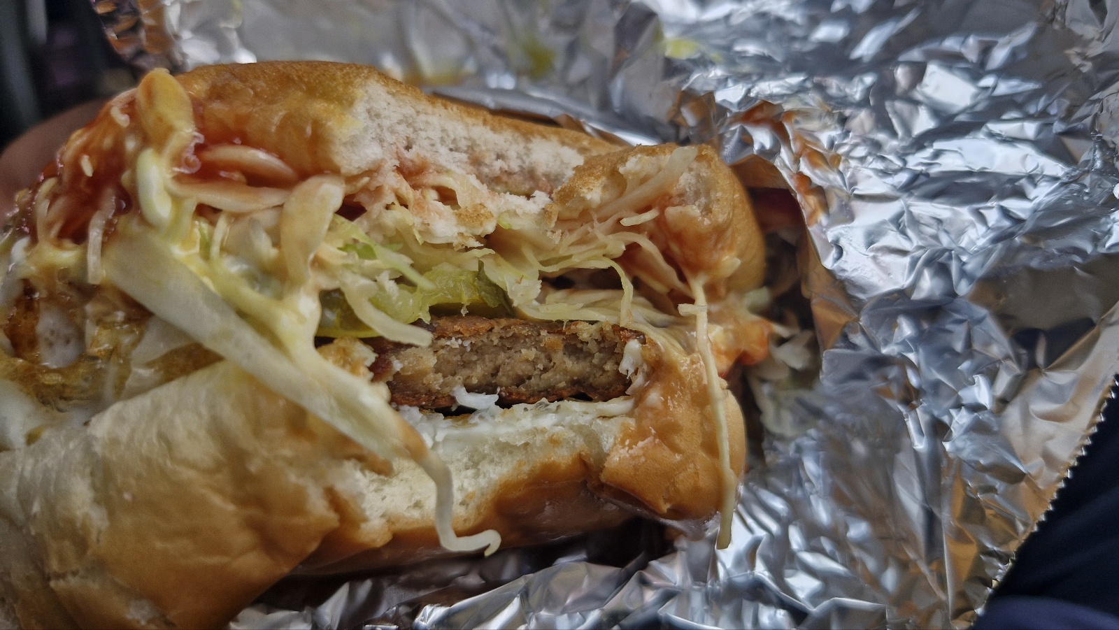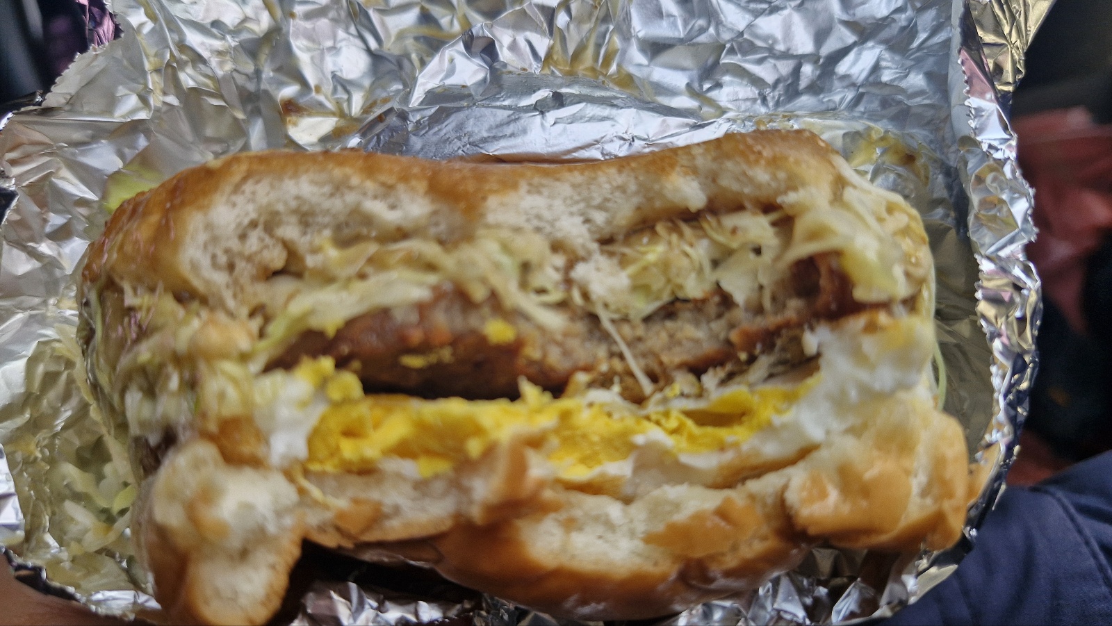 빵사이에 계란프라이가 일반보다 아주 빠삭하게 조리되어 있고, 고기패티, 피클, 양배추샐러드 이렇게 들어 있는 거 같습니다.