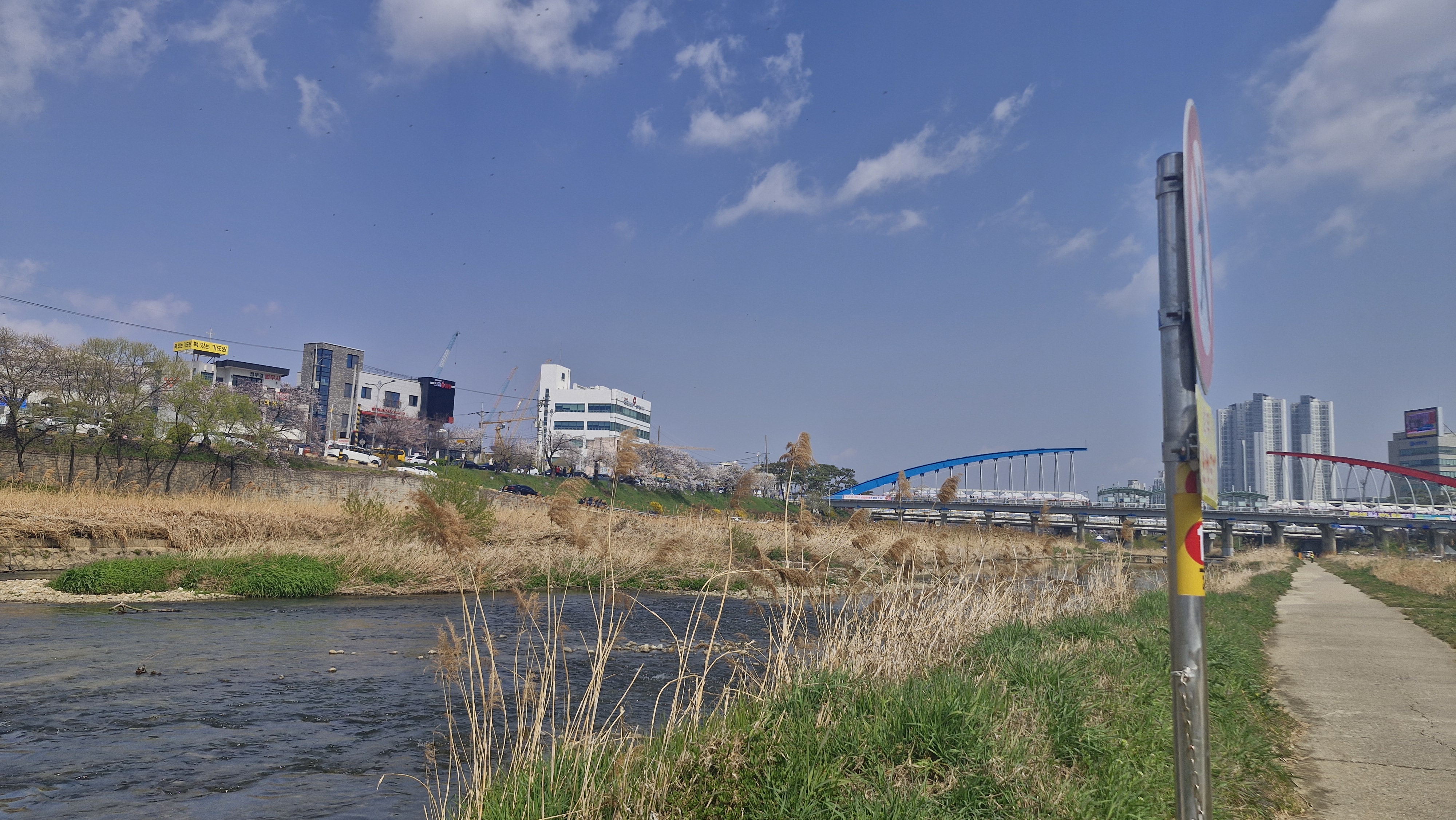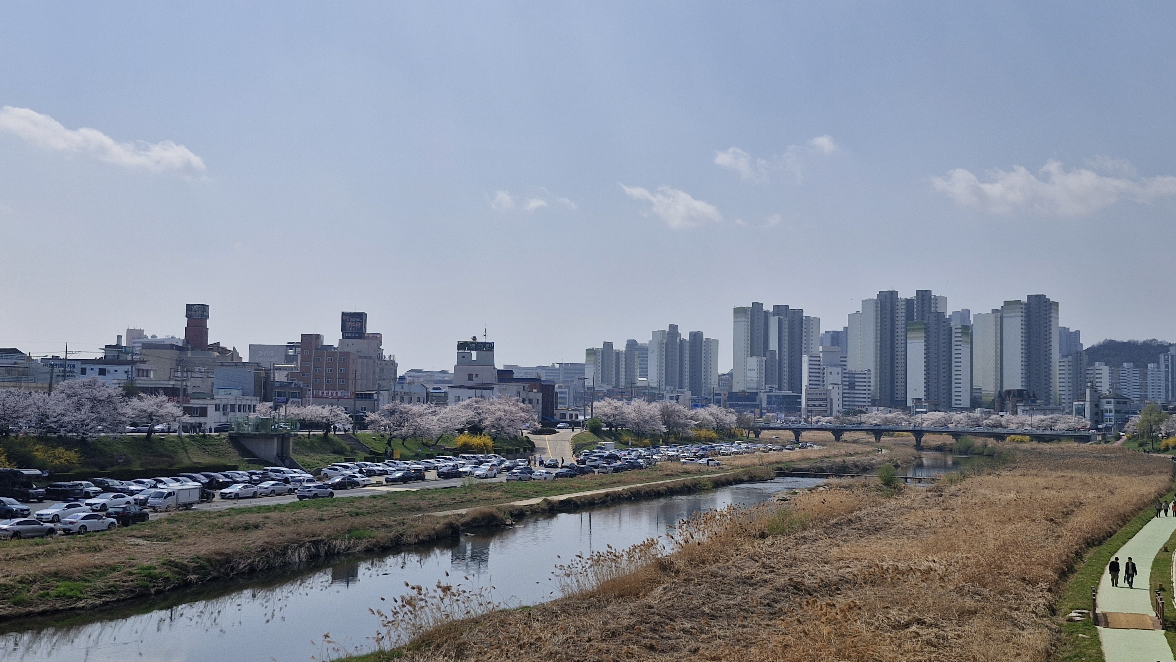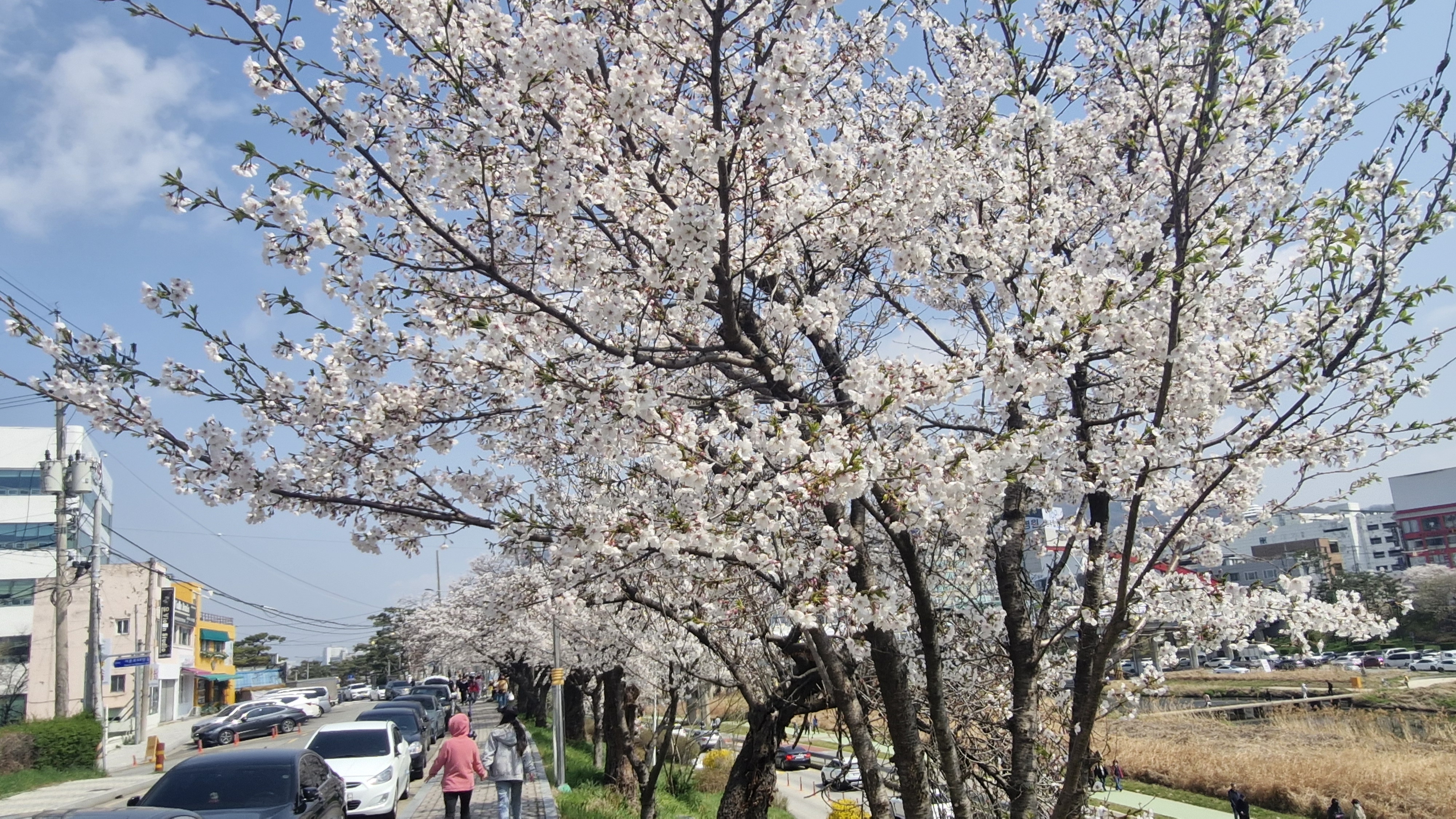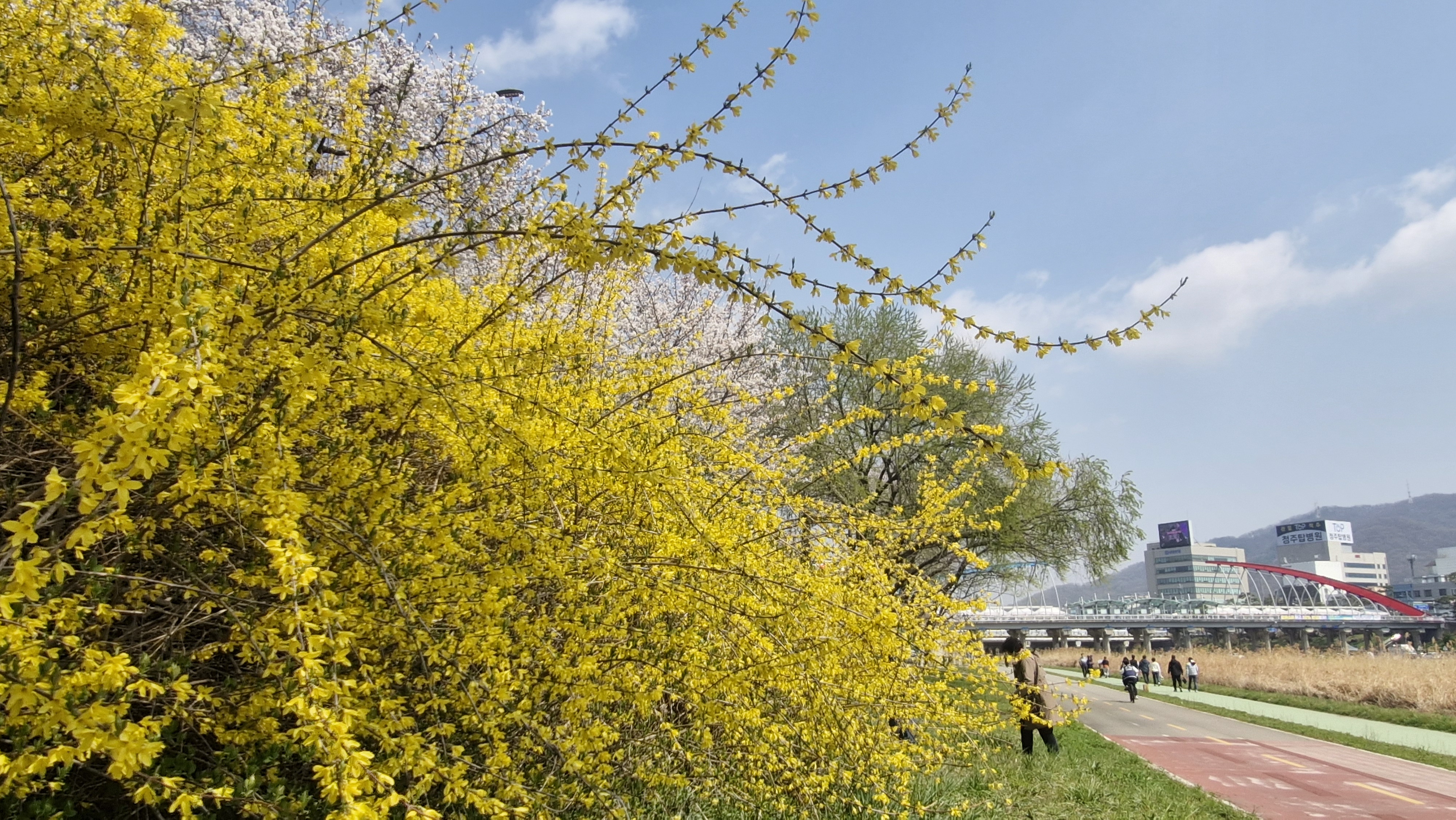 강 양 옆으로 벚꽃이랑 개나리꽃이 이쁘게 피어있습니다.