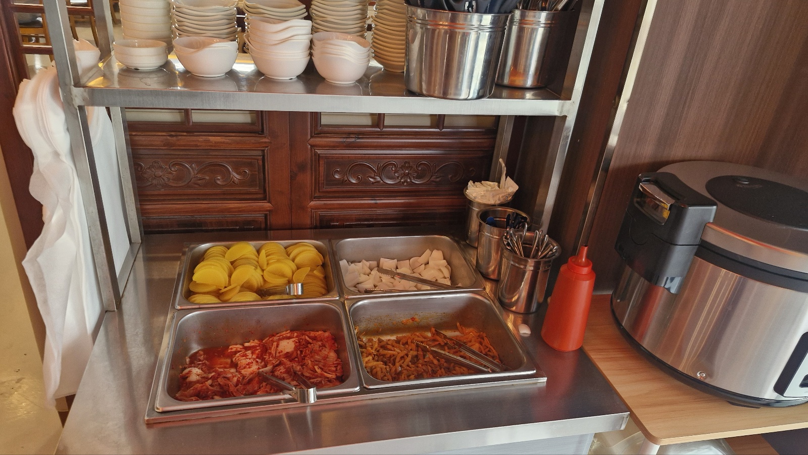 셀프코너에 가시면 김치랑 짜차이 아이용 포크랑 숟가락 단무지랑 양파가 있습니다.